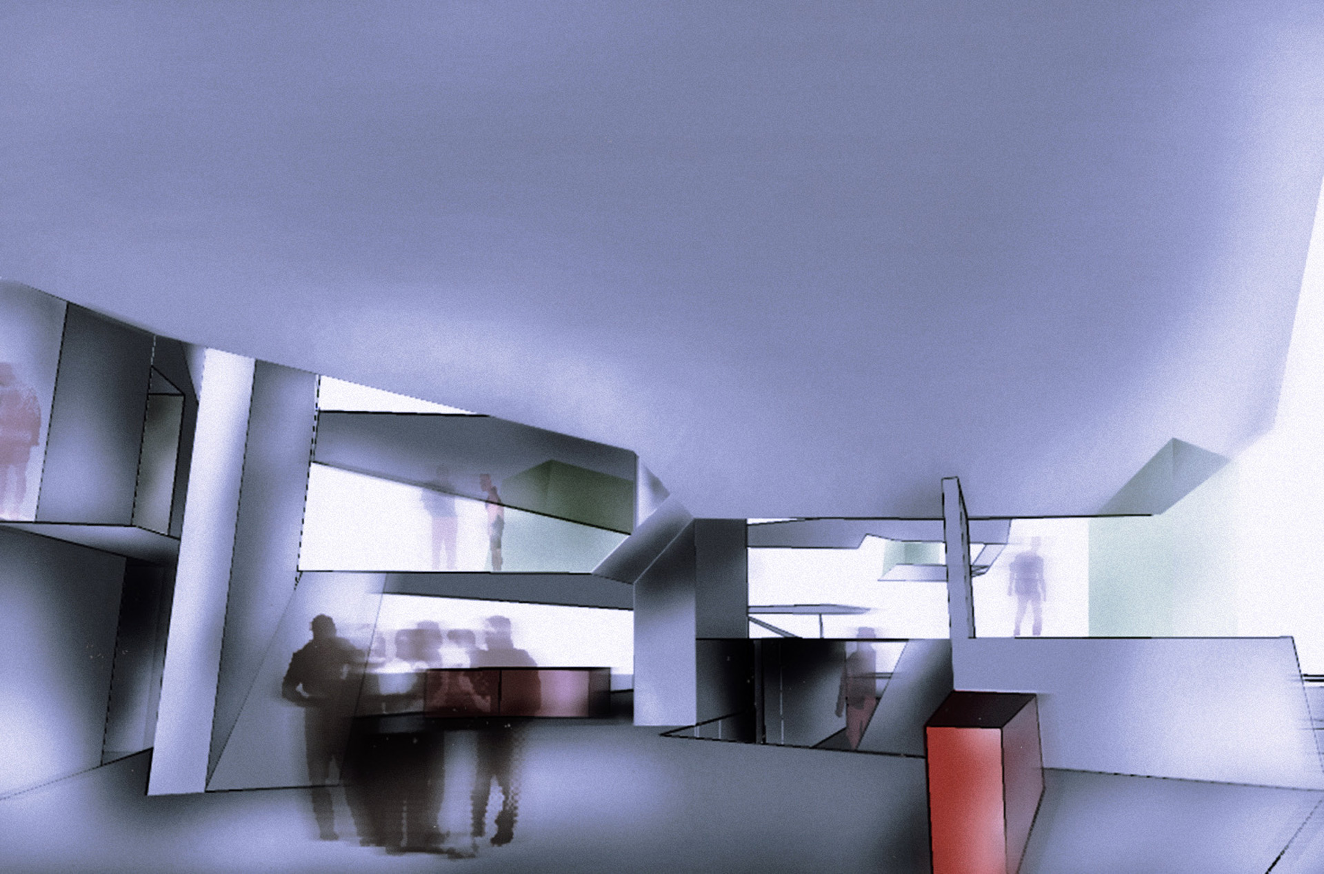 Diese mikroskopische Aufnahme (Bild von Lennart Nilsson; Blutgerinnung, weiss = Fibrinfäden) wurde zum Leitbild der Struktur bzw. Raumkonzeption: fließender Raum, der alle Geschosse mit einbezieht, aus der Bewegung heraus erlebbare Struktur, d.h. die visuellen Bezüge ändern sich stets (Einheit von Zeit und Struktur), verschiedene Geschwindigkeiten (langsam/schnell) des Raumerlebens möglich, Einheit der Elemente trotz ihrer Unterschiedlichkeit.