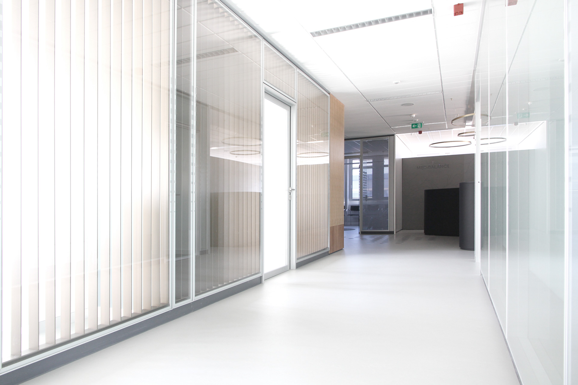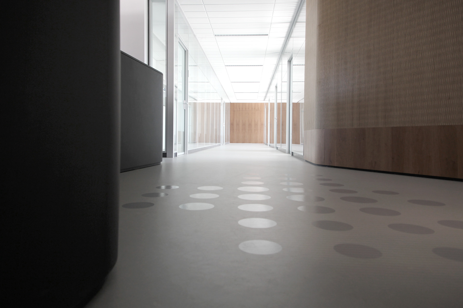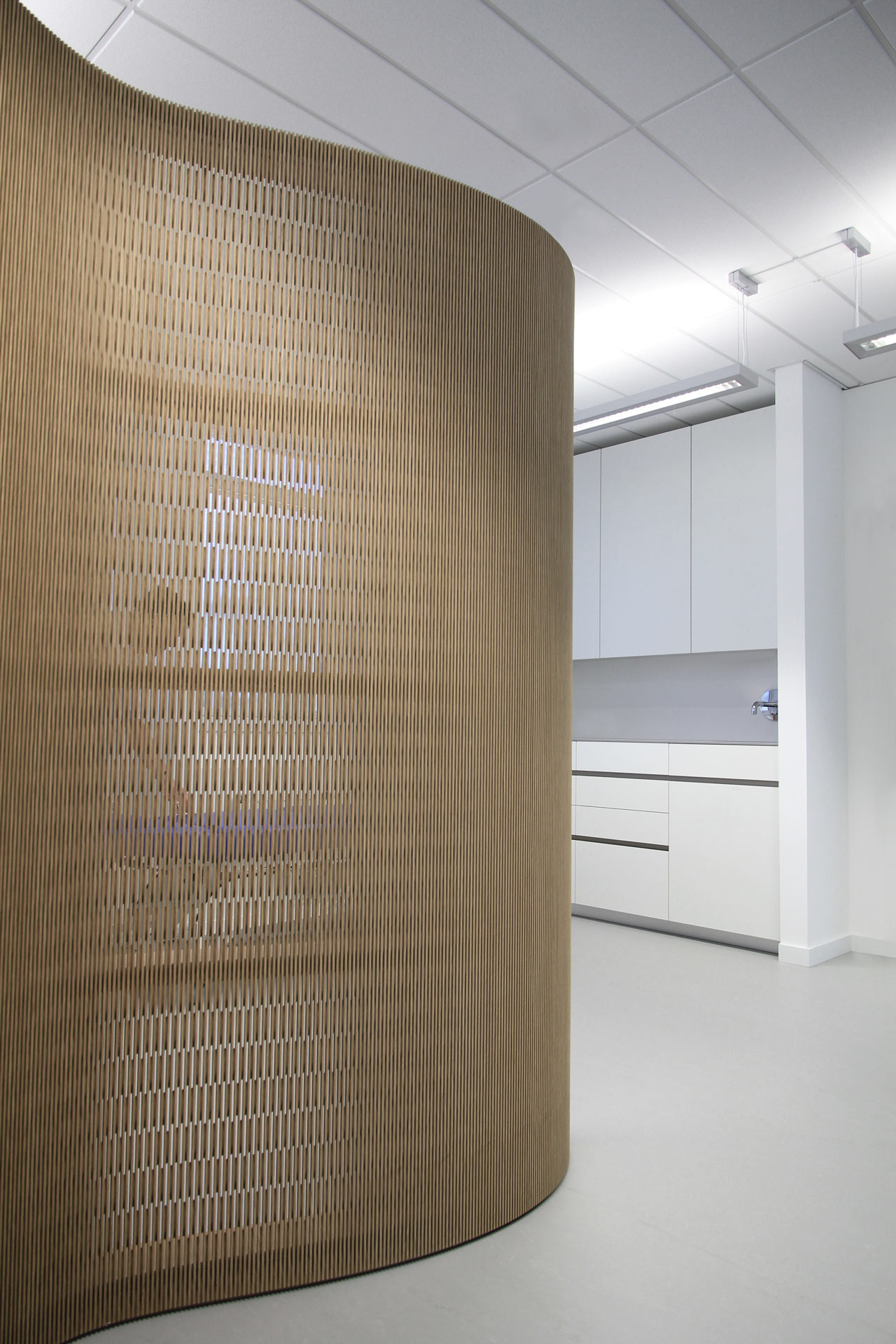 Ausgehend von der klaren Raumaufteilung der Substanz, liegen die Funktionsräume vom offenen Empfang aus bis zum OP-Bereich in einer klaren Abfolge. Der längliche Hauptflur, an dem rechts davon die Behandlungsräume und links die Funktionsräume angeordnet sind, ist durch transparente und opake Glasflächen gekennzeichnet. Durch das rechts von Süden einfallende Licht spiegeln sich die Holzlamellen in der Glasscheibe an der gegenüberliegenden Scheibe wider und rhythmisieren so die Länge des Flurs. Die indirekte Beleuchtung und das Licht- und Schattenspiel schaffen eine ruhige und freundliche Atmosphäre. Am Ende des Korridors ist ein Durchgang zum klinisch reinen Teil der Praxis, der den Operationsbereich beherbergt. Die zurückversetzten Eingänge zu den Schleusen nimmt man zuerst durch das links und rechts von der Holzwand einfallende Licht wahr. Die Wand ist zusammen mit dem Filter in der Glasscheibe eine Fortführung des geschwungenen Wandelements im Empfangsbereich, dem deutlichen Orientierungspunkt der Praxis.
