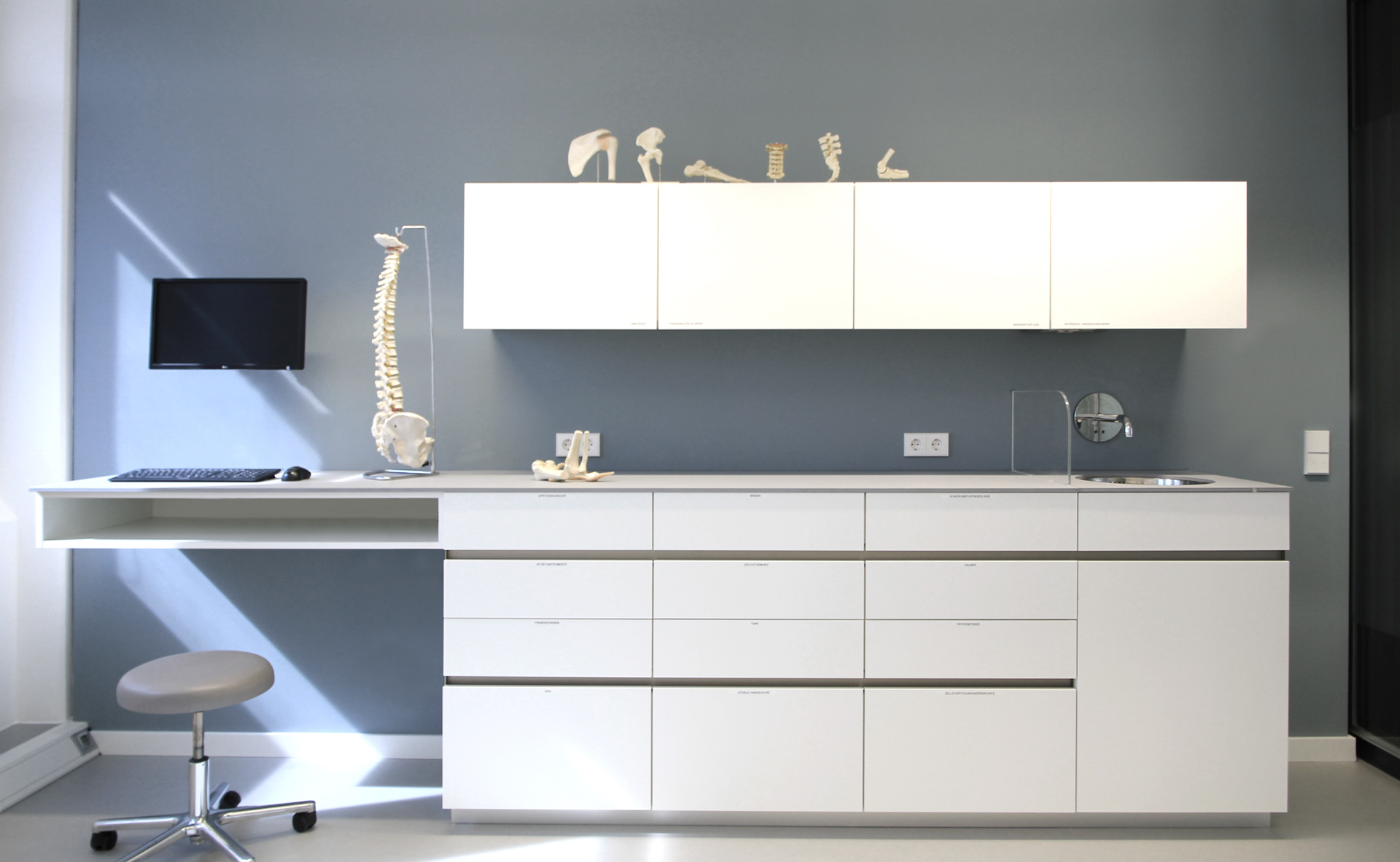 Erreicht wurde dies durch punktuelle Maßnahmen wie die Teilung des langen Flures in den Behandlungs- und OP-Bereich und der Ausbildung eines Knotenpunkts mit Empfang und Wartebereich. Die geschwungenen Elemente wie Tresen und Wand sind nicht nur eine klare Wegführung für den Patienten, sondern auch Gestaltungselemente, die den Raum prägen und individualisieren. Die offene Raumstruktur beim Empfang, mit nicht raumhohen Trennwänden und transparenter Wand hin zum Wartebereich, verschaffen einen schnellen Überblick beim Eintreten.