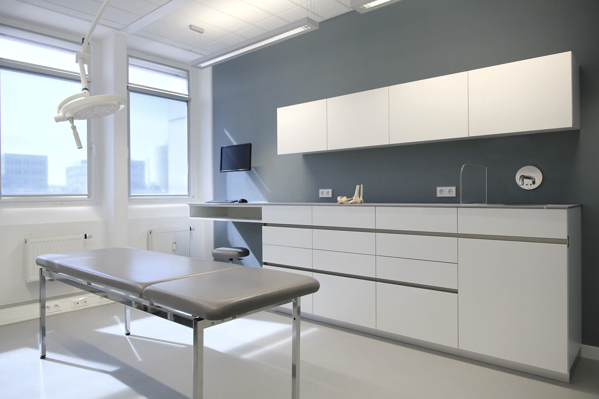 Die Planung der Chirurgischen Praxis war bestimmt durch die Struktur der bestehenden länglichen Büroetage, in die sie eingebaut werden sollte. Die Aufgabe bestand darin, die funktionellen Anforderungen einer chirurgischen Praxis in die gegebene Raumaufteilung maßstäblich einzubringen und einen atmosphärisch einladenden Raum für Patienten und Personal zu schaffen.