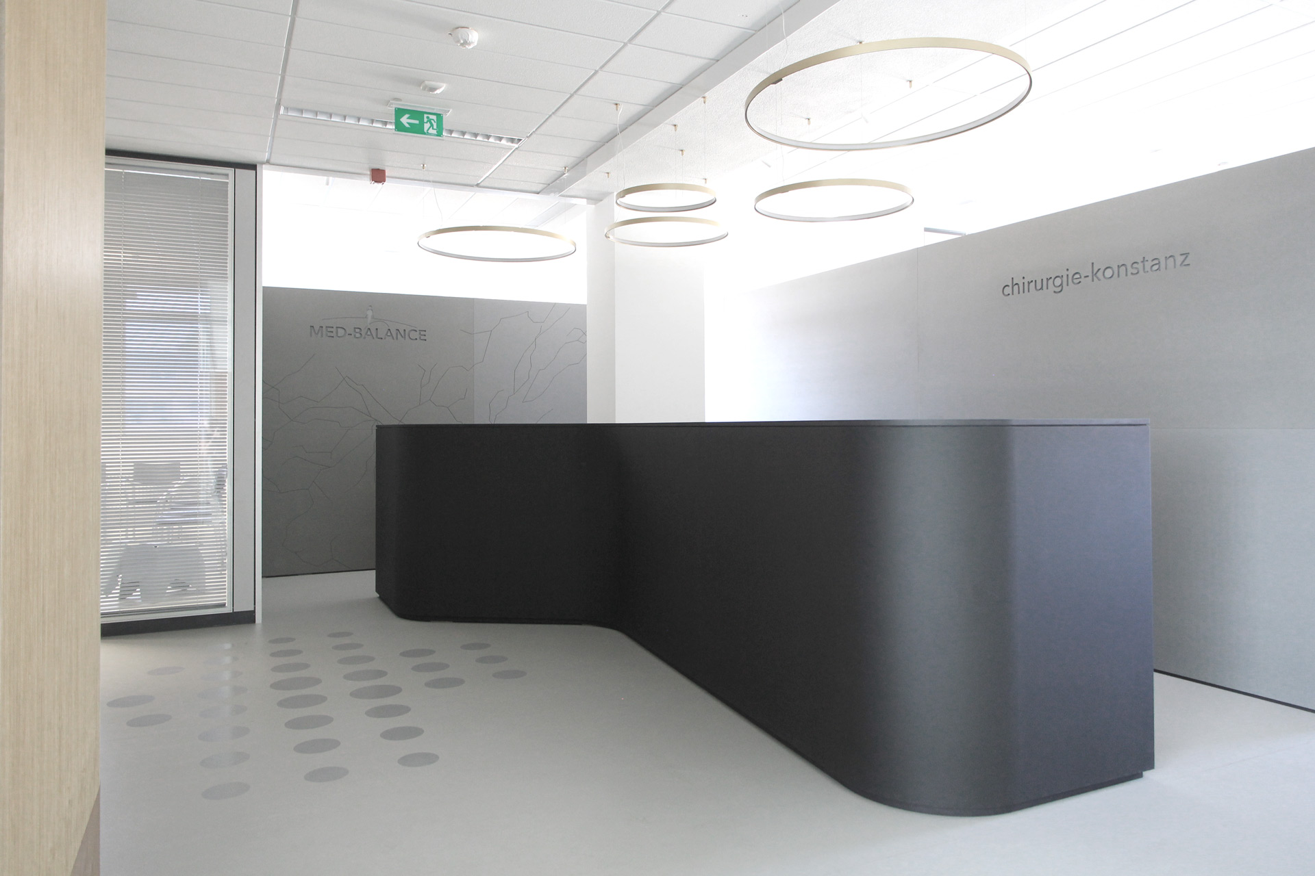 Das grafische Muster auf dem Boden als Kennzeichnung des Knotenpunkts der Praxis und die grün-blau-graue Farbigkeit des Flurs greifen das Logo auf. Auch die gold matten Lichtringe über dem Tresen fügen sich optimal als Blickfänger in das Farbkonzept ein und tauchen alles in ein warmes, angenehmes Licht.