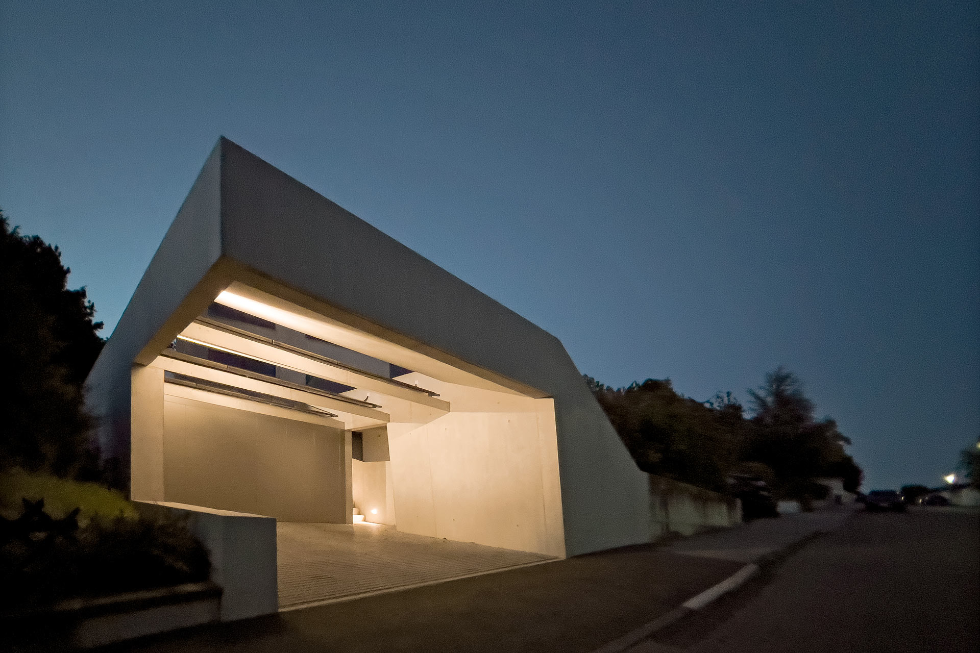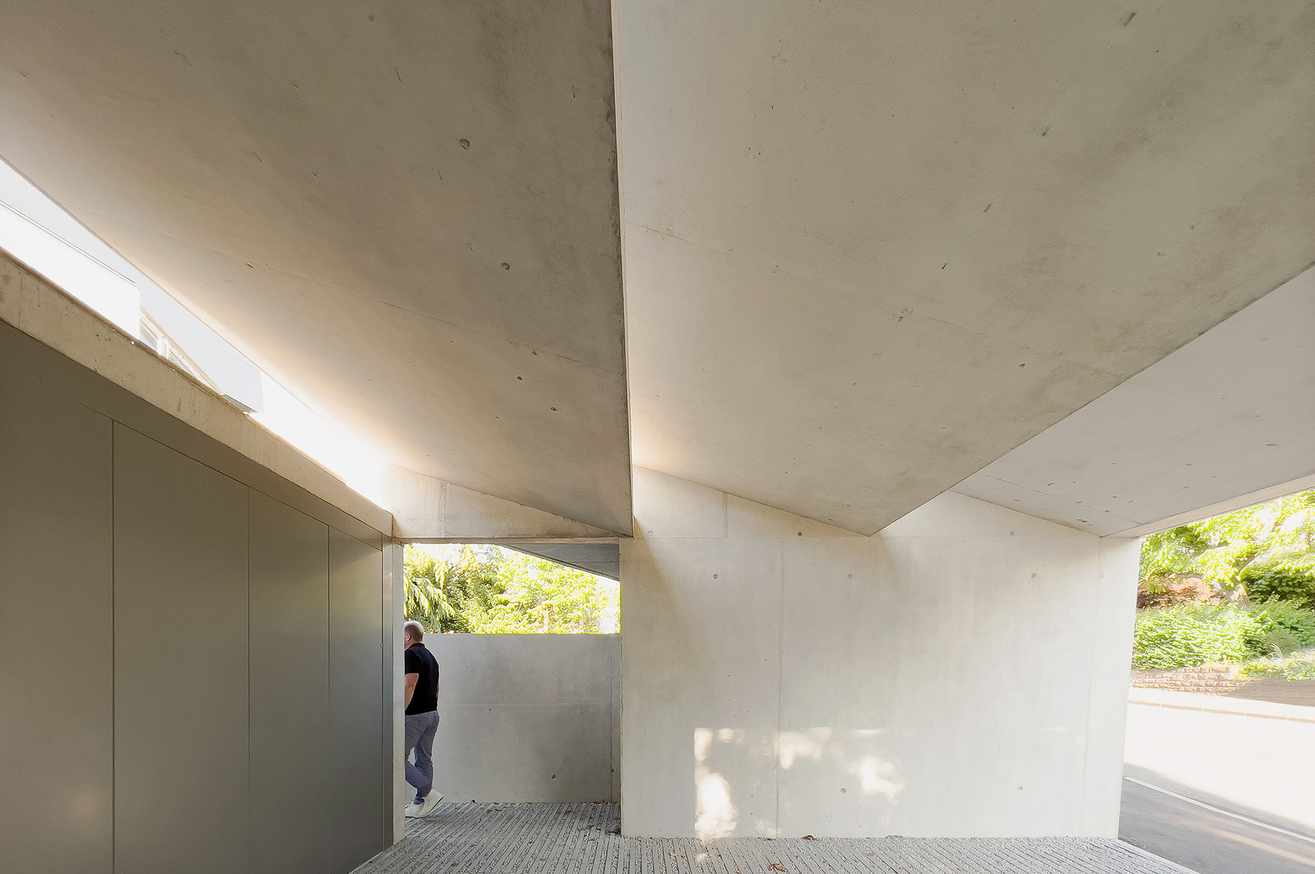 Die moderne Sichtbetongarage besticht nicht nur durch ihre Funktionalität, sondern auch durch ihre ästhetische Gestaltung. Die dynamische Form, die Sheddächer zur Belichtung und Energiegewinnung, die Integration in den Hang und der begleitende Nebenzugang verleihen dem architektonischen Ensemble eine ansprechende Gesamtwirkung. Diese Erweiterung des ursprünglichen Gebäudes von 1929 ist ein gelungenes Beispiel für zeitgemäße Architektur, in der Funktionalität, Ästhetik und Nachhaltigkeit harmonisch miteinander verschmelzen.