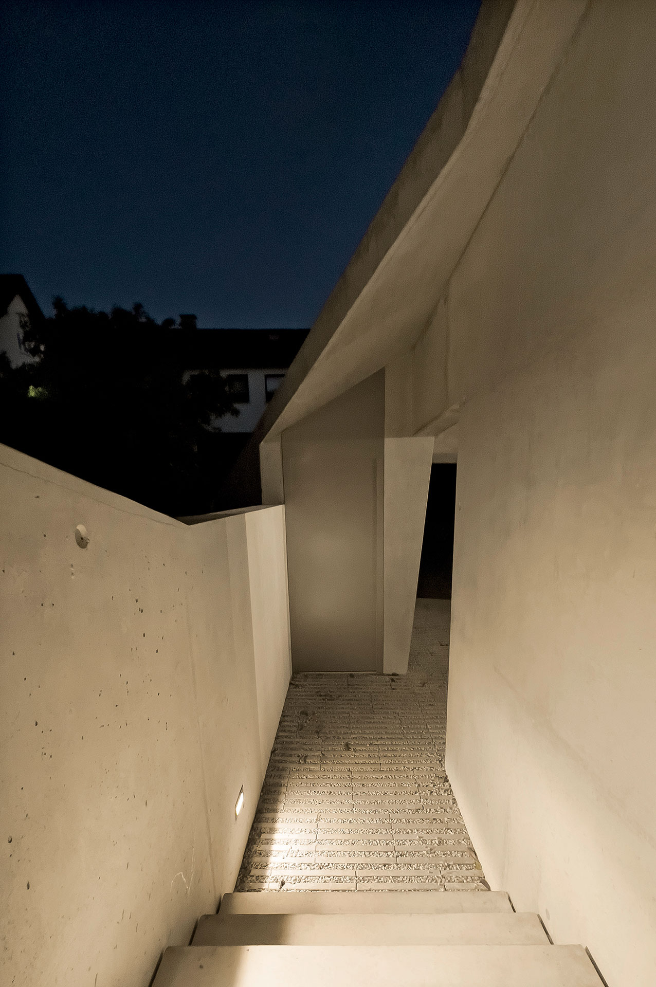 Um den Platzbedarf zu minimieren, wurde die Energiezentrale in die bestehende Sockelebene integriert, wodurch sie möglichst wenig Freifläche des Wohngebäudes im Gartengeschoss beansprucht. Sie scheint geradezu aus dem Hang herauszuwachsen, begleitet von einem Nebenzugang zum Haus, der parallel verläuft. Dadurch entsteht eine organische und harmonische Verbindung zwischen Hauptgebäude und Sockel.