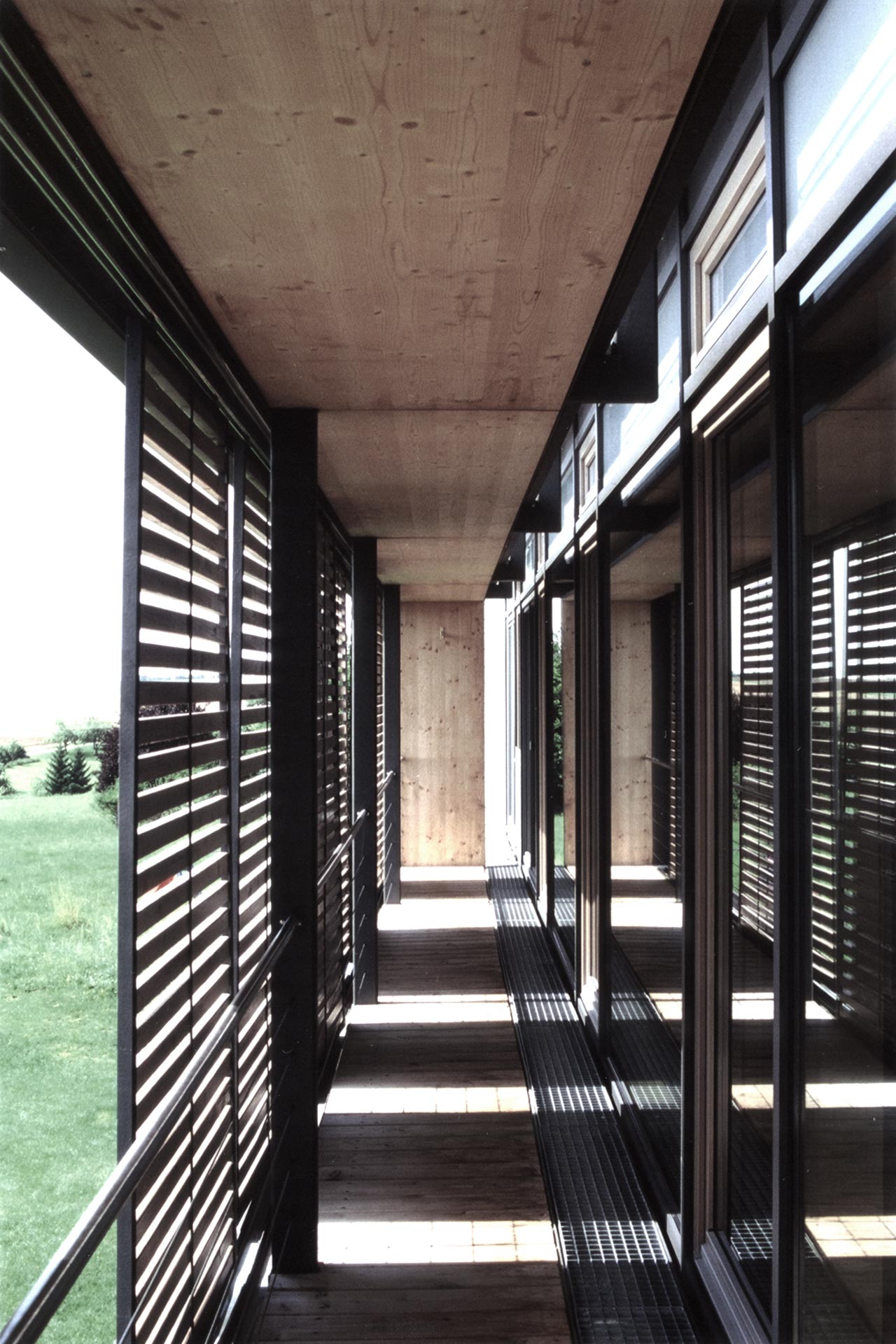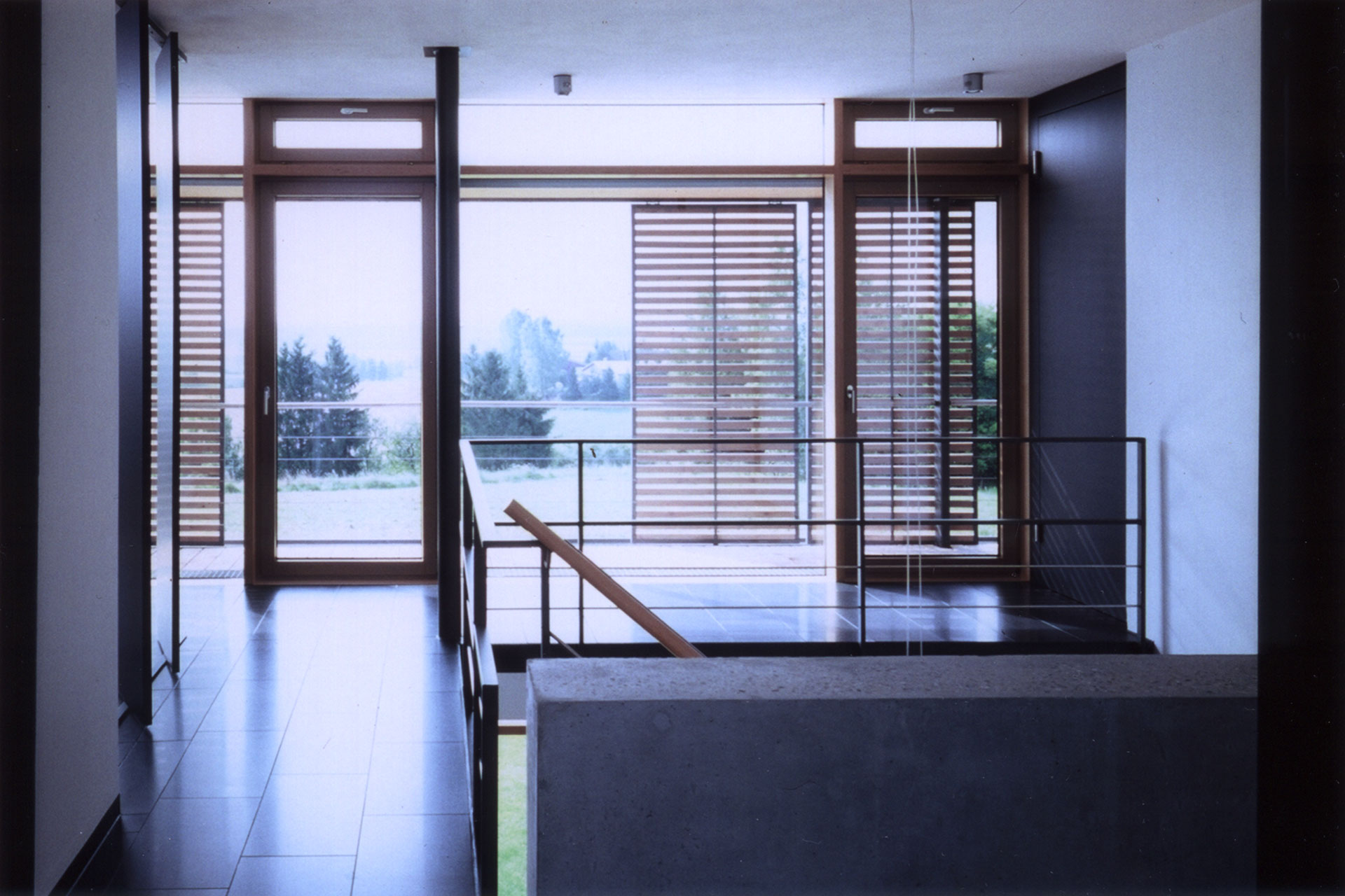 Den Abschluss und Filter vor der Landschaftskulisse des Donaurieds bildet im Süden der vorgehängte Balkonrahmen, der mit seinen verschiebbaren Verschattungselementen immer neue Bilder kreiert.