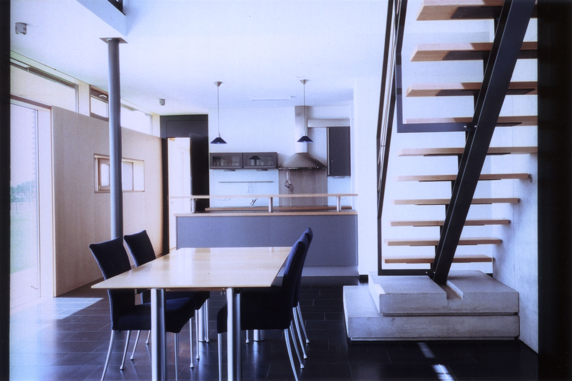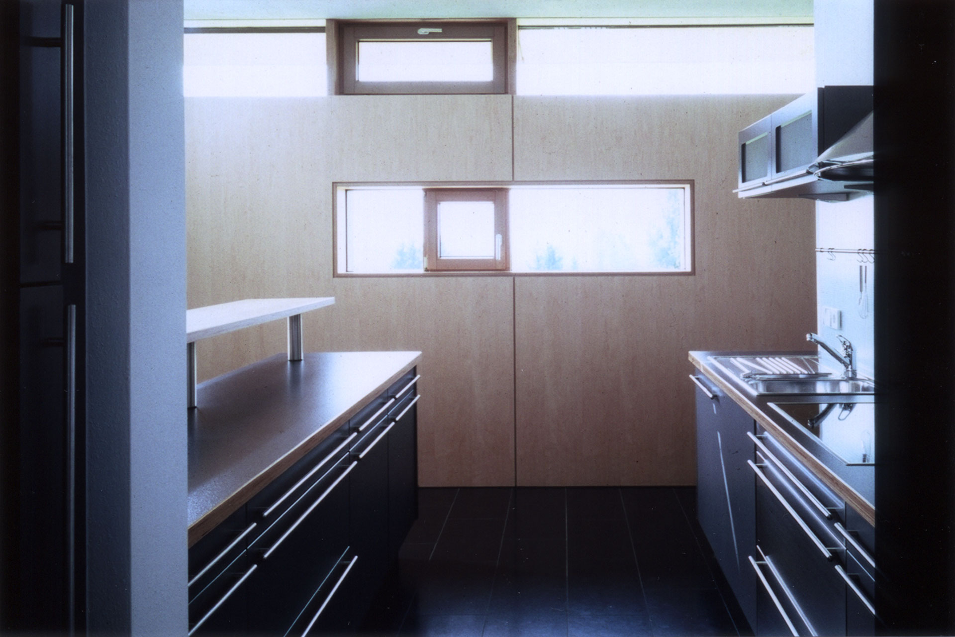 Längs der verglasten Südfassade, zum Licht, liegen linear angeordnet, in ihrer Qualität gleichwertig Wohn- und Schlafräume sowie die Küche, deren Raumvolumen von Bewegungsraum umflossen wird.