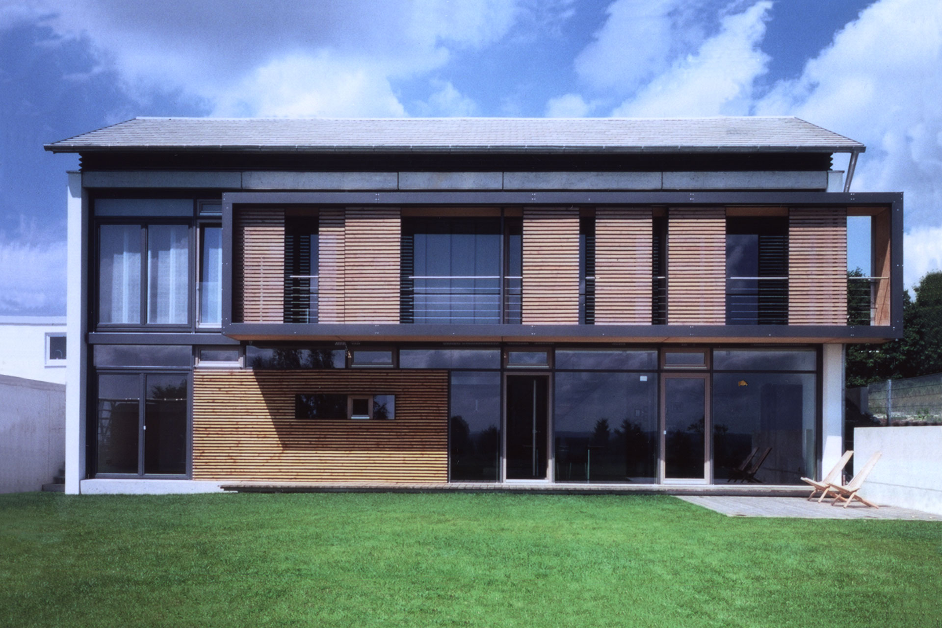 Auf dem schlichten, rechteckigen Mauerwerkskörper liegt durch eine deutliche Fuge getrennt, die Dachhaut des ruhige Satteldachs das im Bebauungsplan gefordert wurde.