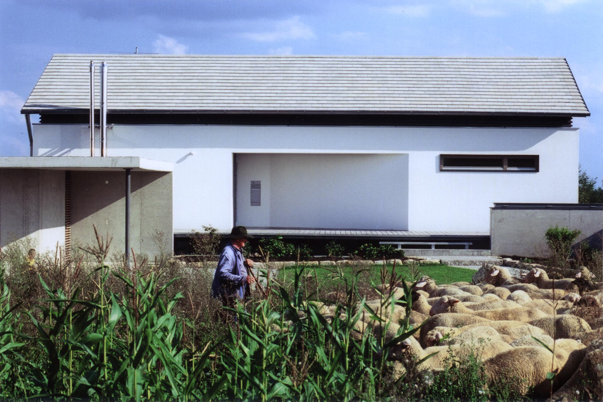 Das Gebäude erscheint von 3 Seiten als geschlossener, schlichter, rechteckiger Mauerwerkskörper mit einem Satteldach. Zum Süden hin und in Richtung der Landschaft öffnet er sich und wird leicht.
