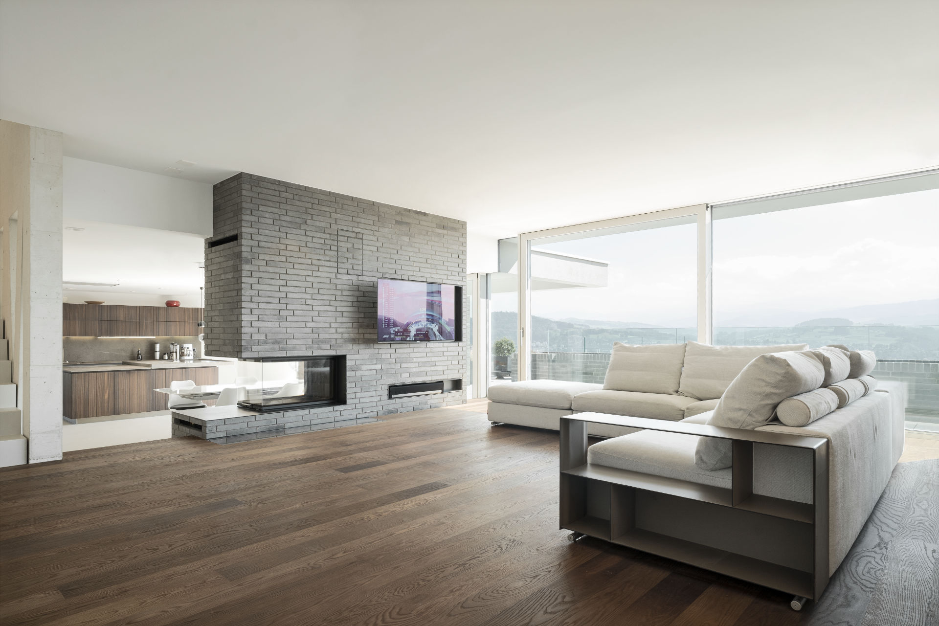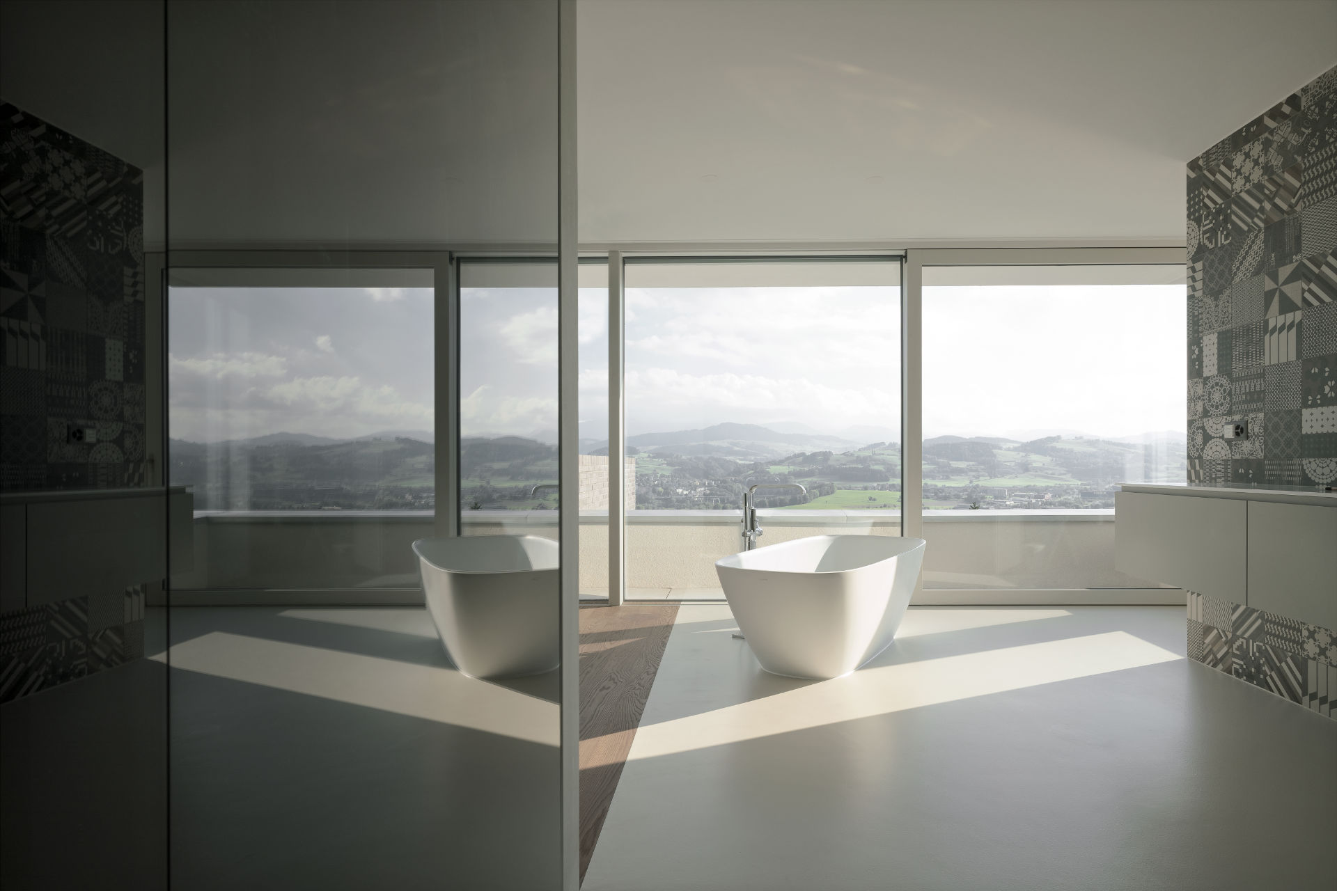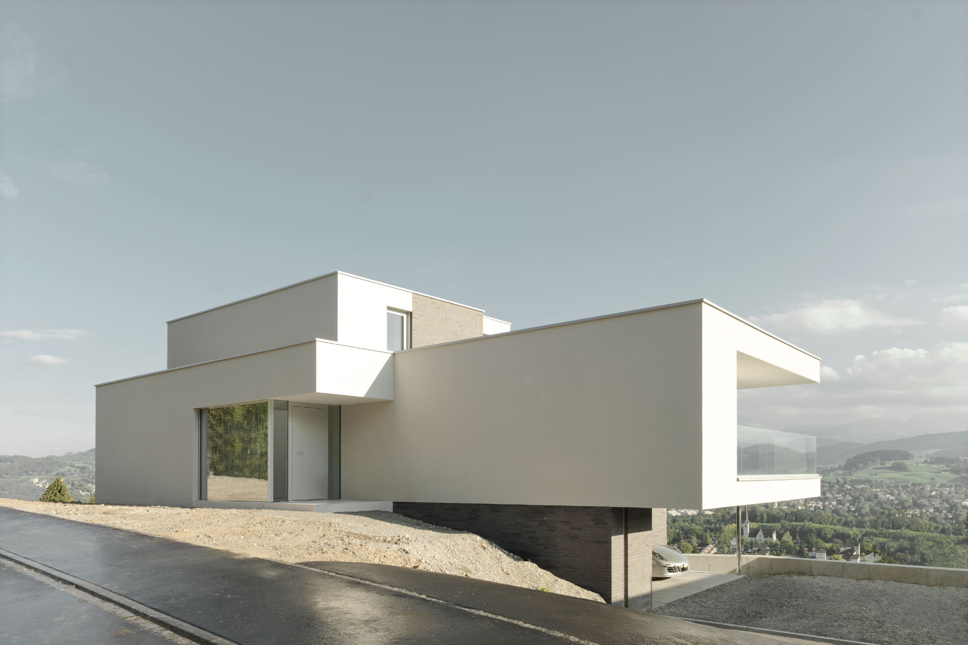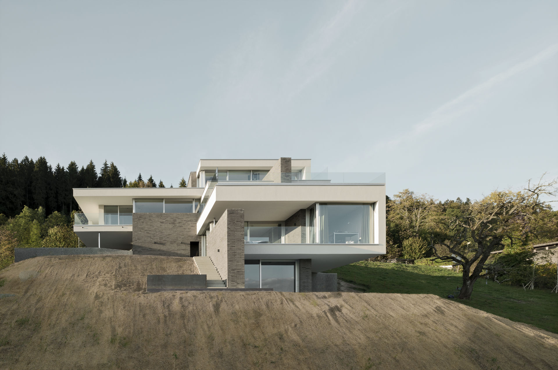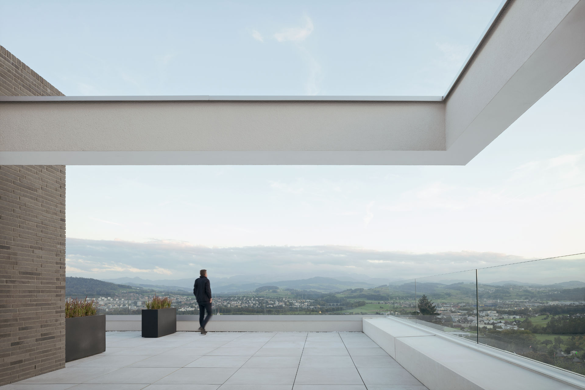 Ein Rundgang durch das Gebäude lässt einen erkennen, dass es nicht nur um das Schaffen von signifikanten Räumen, sondern auch um eine Inszenierung der Ausblicke ging. Dank des Split-Level-Systems sind die Räume fliessend miteinander verbunden, wechseln sich engere Bereiche mit offenen Zonen ab, werden Räume mit unterschiedlicher Himmelsausrichtung geschaffen. Je nach Situation wird der Ausblick zum Bildausschnitt oder Panorama. Jede Richtungsänderung in der Bewegung durchs Haus eröffnet neue Bezüge innerhalb der Räume und nach Aussen. Eine einläufige, quer im Grundriss liegende Treppe führt vom Zugangsgeschoss entweder zum Elternbereich im Attikageschoss oder zu den Schlaf- und Aufenthaltsräumen im Hanggeschoss. Von dort aus bewegt man sich längs zum Hang in den kontemplativen Sauna- und Fitnessbereich im Untergeschoss, dessen überdachter Aussenbereich von der mit Klinker bekleideten Längswand geprägt ist. Alle hangberührenden Geschosse können zusätzlich über eine aussenliegende Treppe oder den Hang abwärts begleitende Aussenstufen erreicht werden.